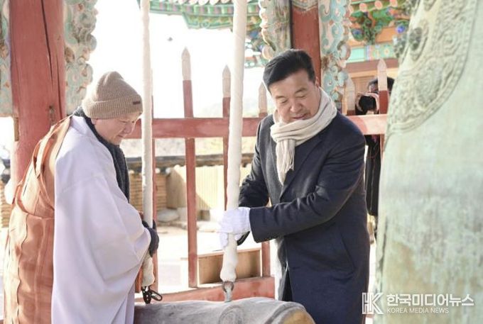 이어 수덕사 범종각에서 새해를 알리고 한 해 안녕을 기원하는 신년타종 행사에 참석했다.