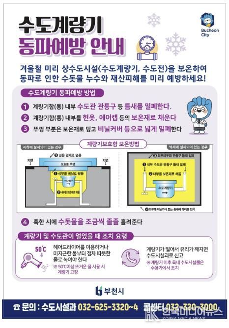 [ 한국미디어뉴스 김만길 기자 ] 부천시는 기온이 큰 폭으로 떨어지는 겨울철을 맞아 수도계량기 동파 사고에 선제적으로 대응하기 위해 내년 2월까지 ‘동절기 수도계량기 동파 예방대책’을 마련해 추진 중이다. 이번 대책은 한파에 따른 수도시설 피해를 줄이고 시민 불편을 최소화하려는 조치다.