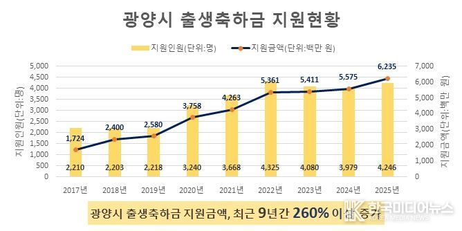 광양시의 출생축하금 지원 예산은 최근 9년 사이 크게 늘었다. 시에 따르면 2017년에는 17억 2,400만 원을 편성해 2,210명에게 지원했으며, 2025년에는 62억 3,500만 원을 투입해 4,246명에게 지원했다. 예산 기준으로 약 260% 이상 증가한 규모다.