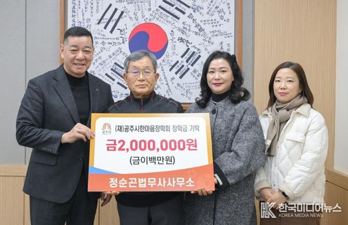 [ 한국미디어뉴스 이원영 기자 ] 정순곤법무사사무소는 지난 6일 (재)공주시한마음장학회에 가정형편이 어려운 학생들을 위한 장학금 200만 원을 기탁했다.