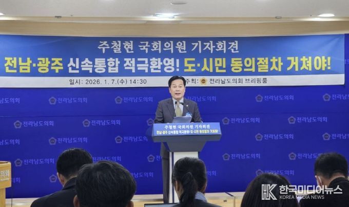 [ 한국미디어뉴스 이원영 기자 ] 주철현 더불어민주당 국회의원(전남 여수시갑)은 7일 오후 2시 30분, 전남도의회 브리핑룸에서 기자회견을 열고, 광주·전남 행정통합에 대한 적극적인 환영 입장과 함께 통합의 방향에 대한 의견과 비전을 밝혔다.