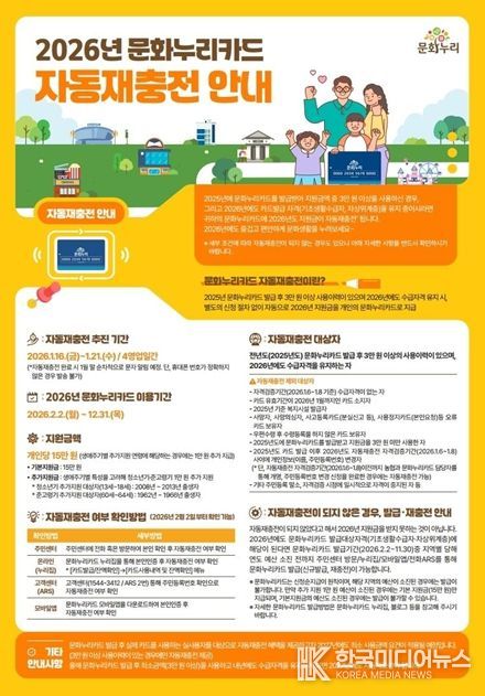 [ 한국미디어뉴스 이원영 기자 ] 인천문화재단은 2026년 1월 16일부터 1월 21일까지 문화누리카드 지원금이 자동으로 재충전된다고 밝혔다.