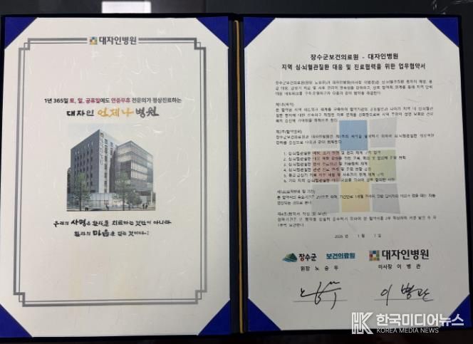 [ 한국미디어뉴스 이종철 기자 ] 장수군은 대자인병원과 심뇌혈관질환 발생 시 신속하고 효과적인 대응을 위해 상호 진료협력 체계를 구축하는 ‘심뇌혈관질환 대응 진료협력 협약(MOU)’을 체결했다고 9일 밝혔다.