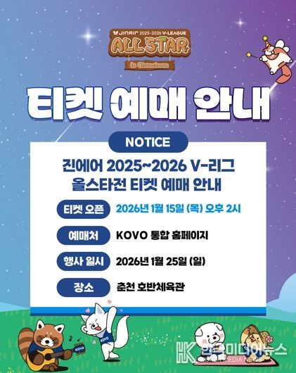 한국배구연맹은 오는 25일 호반체육관에서 진에어 2025~2026 V-리그 올스타전을 개최한다. 관람권 예매는 15일 오후 2시부터 KOVO 누리집과 공식 애플리케이션을 통해 진행된다. 관람권 가격은 좌석에 따라 3만 원부터 6만 원까지다. 올스타전 당일에는 정오부터 시야방해석, 난간 앞 좌석, 온라인 예매 취소분에 한해 현장 판매도 실시한다.