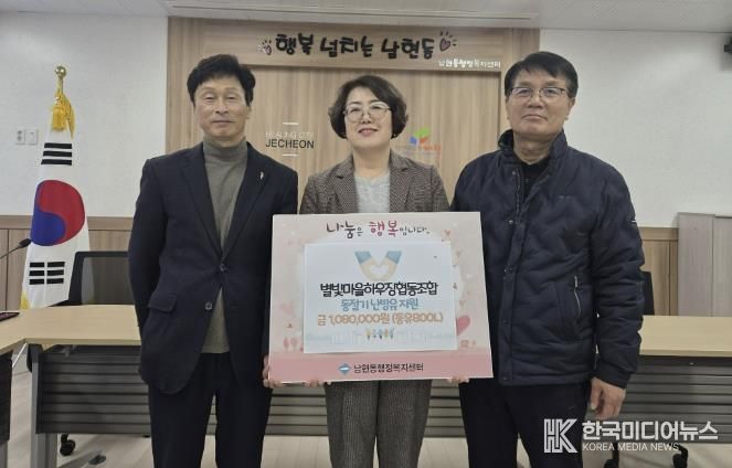 [ 한국미디어뉴스 김풍옥 기자 ] 제천시 별빛마을하우징협동조합은 지난 9일, 남현동행정복지센터를 방문해 취약계층을 위한 난방유를 기부했다.