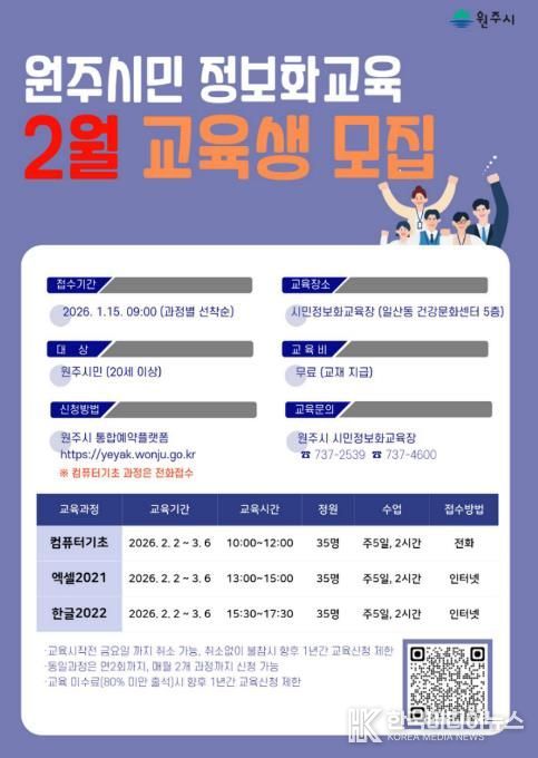[ 한국미디어뉴스 이원영 기자 ] 원주시는 시민들의 디지털 활용 능력 향상과 정보 격차 해소를 위해 시민정보화교육 2월 수강생을 모집한다.