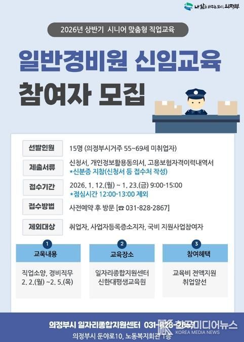 [ 한국미디어뉴스 김서안 기자 ] 의정부시는 관내 시니어 세대의 재취업을 지원하고 안정적인 일자리를 연계하기 위해 ‘일반경비원 신임교육’ 참여자를 모집한다.