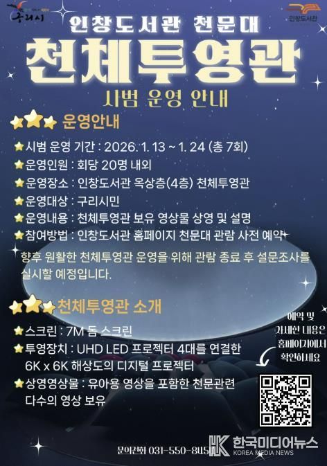 [ 한국미디어뉴스 김서안 기자 ] 구리시는 오는 1월 13일부터 24일까지 인창도서관 옥상에 설치된 천체투영관의 시범운영을 실시한다고 밝혔다.