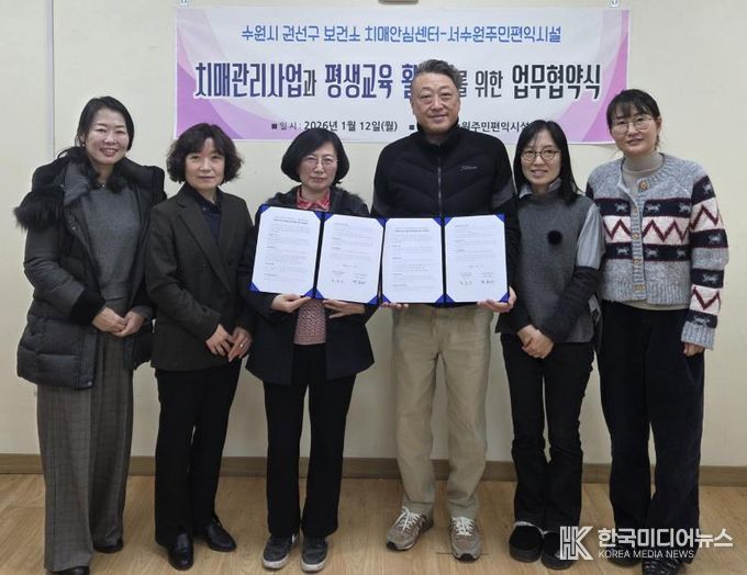 협약에 따라 서수원주민편익시설은 치매관리서비스 연계 프로그램 운영과 치매인식개선 활동을 지원하고, 권선구보건소 치매안심센터는 건강교육과 예방 활동, 치매관리서비스 연계를 담당한다.