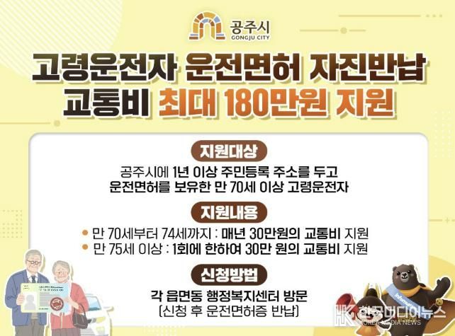 [ 한국미디어뉴스 이원영 기자 ] 공주시는 고령운전자의 운전면허 자진반납을 유도하기 위해 올해부터 교통비 지원금을 최대 180만 원까지 상향했다고 밝혔다.