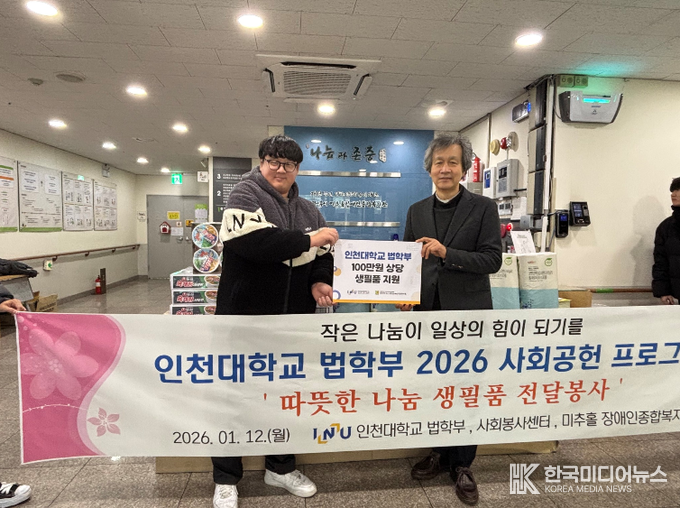 [ 한국미디어뉴스 이원영 기자 ] 인천대학교 법학부 재학생들이 겨울 한복판에서 지역사회 이웃의 일상에 조용한 힘이 되어주는 나눔 활동에 나섰다. 거창한 말보다 손에 쥔 생필품 상자 하나로 마음을 전한 하루였다.