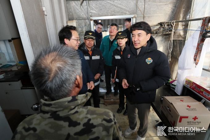 [ 한국미디어뉴스 이원영 기자 ] 김진태 강원특별자치도지사는 1월 13일 밤부터 도내 한파주의보가 발효될 전망에 따라 춘천시 신동면에 위치한 비주택 주거지를 방문해 주거환경 취약계층의 겨울철 안전대책을 점검했다.
