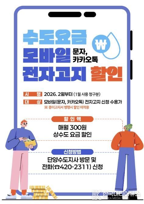 [ 한국미디어뉴스 김풍옥 기자 ] 단양군은 종이 고지서 발송에 따른 행정비용과 환경 부담을 줄이고, 군민의 요금 납부 편의성을 높이기 위해 수도요금 모바일(문자·카카오톡) 전자고지 할인 제도를 오는 2월부터 시행한다고 밝혔다.