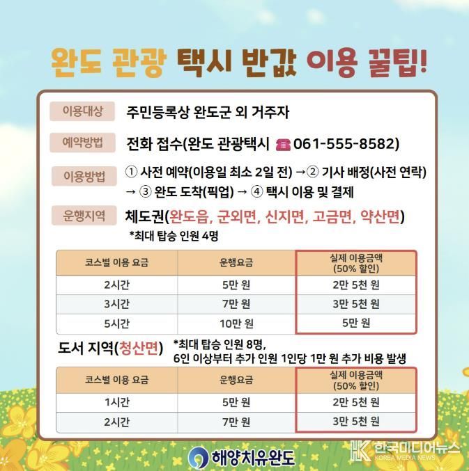 군 관계자는 “반값 관광 택시를 통해 이동의 불편함을 줄이고, 매력 있는 완도 관광지를 두루두루 둘러보시길 바란다”라고 말했다.