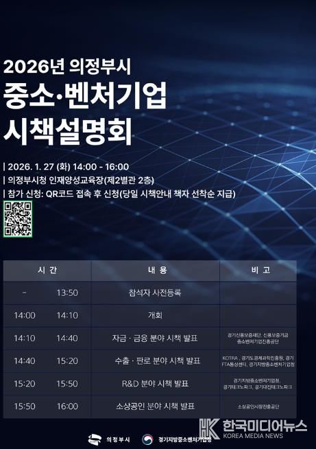 [ 한국미디어뉴스 김서안 기자 ] 의정부시는 ‘2026년 중소‧벤처기업 시책설명회’에 참가할 지역 중소‧벤처기업인을 1월 26일까지 모집한다.