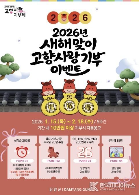 [ 한국미디어뉴스 이종철 기자 ] 담양군이 2026년 병오년(丙午年) ‘붉은 말의 해’를 맞아 1월 15일부터 2월 18일까지 5주간 고향사랑기부 이벤트를 실시한다.