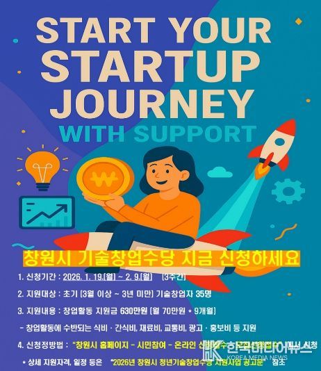 [ 한국미디어뉴스 김홍철 기자 ] 창원특례시는 1월 19일부터 2월 9일까지 ‘2026년 청년기술창업수당 지원사업’ 참여자 35명을 모집한다고 밝혔다.