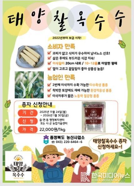 [ 한국미디어뉴스 김풍옥 기자 ] 옥천군농업기술센터는 지역 농가의 소득 증대와 안정적인 옥수수 생산을 지원하기 위해 태양찰옥수수 종자 신청 접수를 받고 있다.