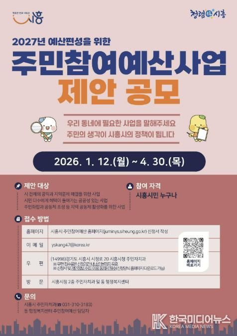 [ 한국미디어뉴스 이보영 기자 ] 시흥시는 오는 4월 30일까지 주민들이 직접 사업을 제안하는 ‘시흥시 주민참여예산 제안’을 신청받는다.