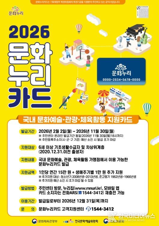 [ 한국미디어뉴스 이원영 기자 ] 태백시는 2026년부터 문화누리카드와 청년문화예술패스 지원을 확대해 문화 취약계층과 청년의 문화 향유 기회를 넓힌다고 밝혔다.