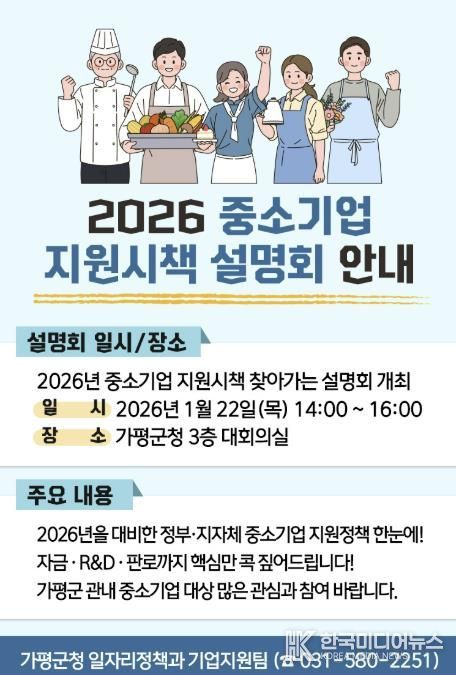 [ 한국미디어뉴스 김서안 기자 ] 가평군이 관내 중소기업의 경영 안정과 경쟁력 강화를 위해 새해 정부의 지원시책을 한자리에 모아 안내하는 설명회를 연다.