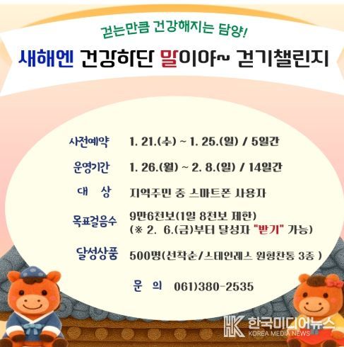 [ 한국미디어뉴스 이종철 기자 ] 담양군은 2026년 새해를 맞아 오는 1월 26일부터 2월 8일까지 온라인 걷기 챌린지 ‘새해엔 건강하단 말이야’를 운영한다고 밝혔다.