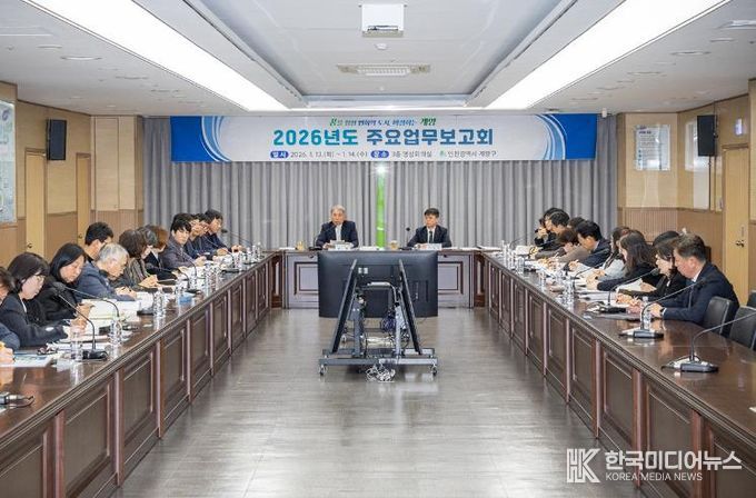 [ 한국미디어뉴스 이원희 기자 ] 인천광역시 계양구는 1월 13일부터 14일까지 이틀간 구청 영상회의실에서 전 부서가 참여하는 ‘2026년도 주요업무보고회’를 개최했다.