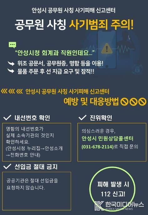 안성시 관계자는 “안성시 공무원은 어떠한 경우에도 선입금을 요구하지 않는다”며 “수상하거나 의심스러운 연락을 받았을 경우, 즉시 신고센터로 문의해 달라”고 당부했다.