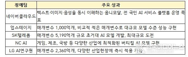 `25년 8월부터 「독자 AI 파운데이션 모델 프로젝트」 정예팀에 선발된 5개 팀이 치열한 경쟁을 통해 기술 혁신을 거듭한 결과, 정예팀이 개발한 AI 파운데이션 모델(`25년말 공개) 5개 모두 미국 비영리 AI연구기관 ‘Epoch AI’의 ‘주목할만한 AI모델(Notable AI Models)’로 등재되는 성과를 거두었다.