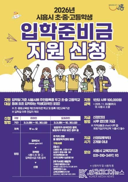 [ 한국미디어뉴스 이보영 기자 ] 시흥시는 올해부터 관내 초중고 입학 자녀 가정에 입학준비금을 10만 원씩 지원한다. 이번 지원은 도서나 문구류 등을 새로 마련해야 하는 신입생 가정의 경제적 부담을 줄여주고, 교육 기본권을 강화하고자 추진됐다.