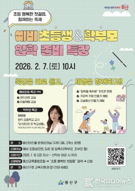 참여 대상은 예비 초등학생(만 5~6세)과 보호자 등 총 150명이며, 신청은 1월 16일부터 선착순으로 접수한다. 참여 신청은 용산구 교육종합포털을 통해 온라인으로 가능하며, 학부모 특강에 한해 행사 당일 현장 접수도 병행 운영한다.