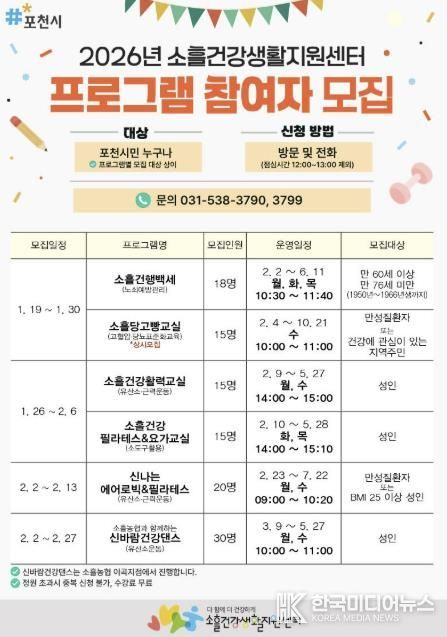 [ 한국미디어뉴스 김서안 기자 ] 포천시 소흘건강생활지원센터는 시민들의 건강 증진과 활기찬 일상 지원을 위해 오는 19일부터 ‘2026년 상반기 건강증진 프로그램’ 참여자를 모집한다.