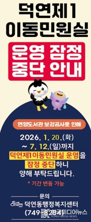 [ 한국미디어뉴스 이종철 기자 ] 순천시 덕연동행정복지센터는 연향도서관 내에 운영 중인 덕연동 제1이동민원실이 도서관 내진성능 보강공사 시행에 따라 오는 1월 20일부터 7월 12일까지 운영을 잠정 중단한다고 밝혔다.