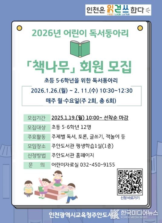 [ 한국미디어뉴스 이원영 기자 ] 인천광역시교육청주안도서관은 예비 초등 5·6학년 학생을 대상으로 하는 독서동아리 '책나무' 회원을 모집한다.