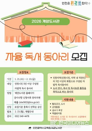 [ 한국미디어뉴스 이원영 기자 ] 인천광역시교육청계양도서관은 지역 내 독서 문화를 확산하고 시민의 자발적인 독서 활동을 지원하기 위해 ‘2026년 자율 독서동아리’를 모집한다.