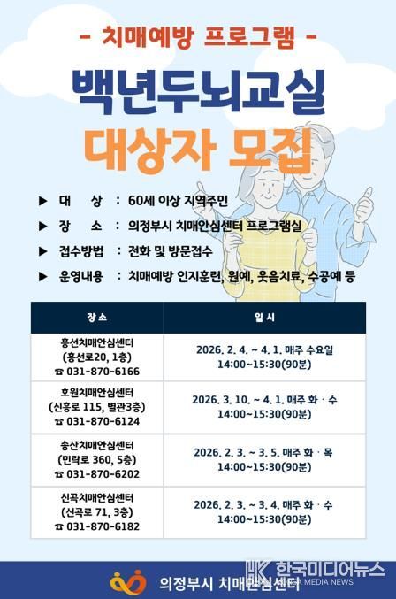 [ 한국미디어뉴스 김서안 기자 ] 의정부시 보건소 치매안심센터는 치매 예방과 인지기능 유지‧향상을 위한 2026년 상반기 치매예방 프로그램 ‘백년두뇌교실 1기’를 운영한다.