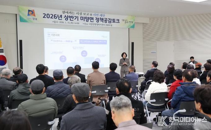[ 한국미디어뉴스 이보영 기자 ] 안성시 미양면은 지난 1월 15일, 미양면행정복지센터 대회의실에서 주민 120여 명이 참석한 가운데 ‘2026년 상반기 미양면 정책공감토크’를 성황리에 개최했다.