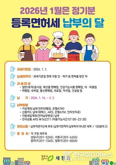 [ 한국미디어뉴스 김풍옥 기자 ] 청주시는 2026년 1월 정기분 등록면허세(면허) 12만1천337건에 대해 총 32억원을 부과했다고 18일 밝혔다. 이는 전년 대비 3천352건, 1억원이 증가한 규모다.