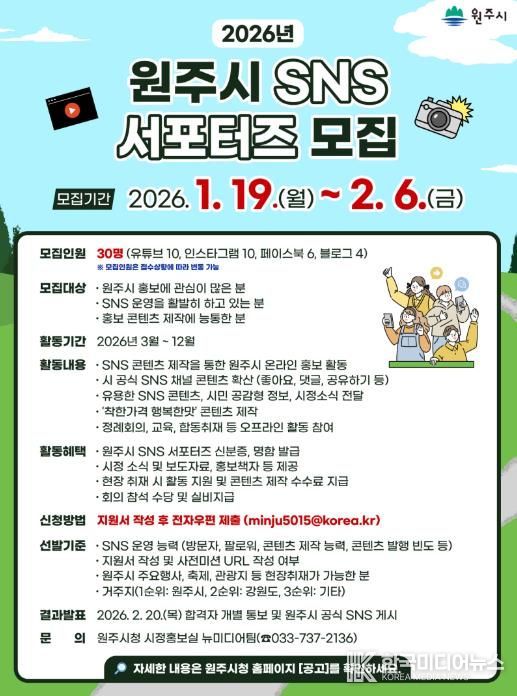 [ 한국미디어뉴스 이원영 기자 ] 원주시는 참신한 아이디어와 열정을 가진 ‘2026년 원주시 SNS 서포터즈’를 다음 달 6일까지 모집한다.