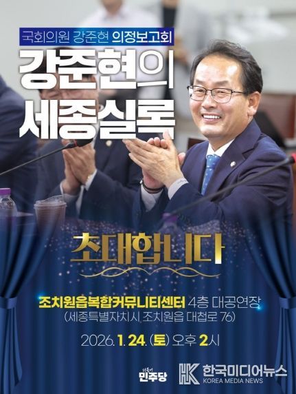 [ 한국미디어뉴스 이원영 기자 ] 더불어민주당 강준현 국회의원(세종시을)이 2026년 1월 24일 오후 2시, 조치원복합커뮤니티센터 대공연장(조치원읍 대첩로 76)에서 의정보고회를 연다.