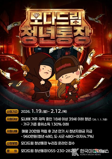 [ 한국미디어뉴스 이원영 기자 ] 경상남도와 경남투자경제진흥원은 청년의 자산 형성과 지역 정착을 돕는 ‘모다드림 청년통장’ 상반기 참여자를 1월 19일부터 2월 12일까지 모집한다고 밝혔다.