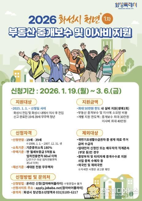 [ 한국미디어뉴스 이원영 기자 ] 화성특례시가 19일부터 3월 6일까지 청년들의 주거비 부담 경감 및 정주 여건 향상을 위한 ‘2026년 상반기 청년 부동산 중개보수 및 이사비 지원사업’ 신청을 받는다.