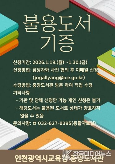 [ 한국미디어뉴스 이원영 기자 ] 인천광역시교육청중앙도서관은 지역사회 내 도서 나눔 문화를 확산하고 지식 자원의 선순환을 실천하기 위해 ‘불용도서 기관 나눔’ 사업을 운영한다.