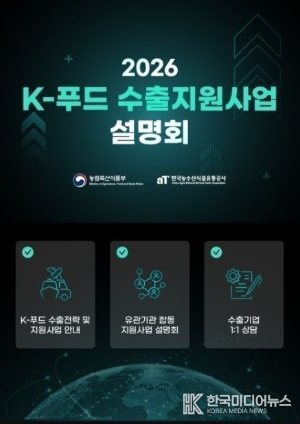 [ 한국미디어뉴스 이원영 기자 ] 농림축산식품부는 K-푸드의 글로벌 진출 확대를 위해 전년보다 900억원 증가한 7,070억원 규모의 2026년 K-푸드 수출지원사업 설명회를 1월 23일 서울 과학기술컨벤션센터에서 개최한다고 밝혔다.