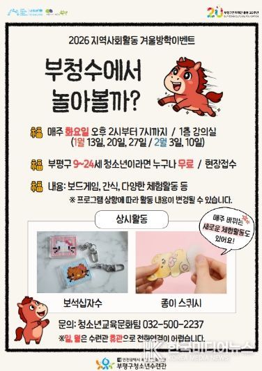 [ 한국미디어뉴스 양선희 기자 ] 부평구 청소년수련관은 오는 20일부터 다음달 10일까지 겨울방학을 맞아 지역 청소년을 위한 2026 지역사회활동 겨울방학 이벤트 ‘부청수에서 놀아볼까’를 진행한다.