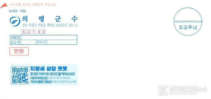 [ 한국미디어뉴스 김홍철 기자 ] 의령군은 지방세 고지서 전면에 ‘지방세 챗봇 상담서비스’ QR코드를 삽입해 발송한다고 밝혔다.