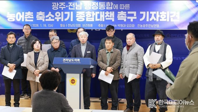[ 한국미디어뉴스 이종철 기자 ] 전라남도의회 박형대 의원(진보당·장흥1)은 1월 19일 도의회 브리핑룸에서 기자회견을 열고 “광주ㆍ전남 행정통합 논의가 속도를 내고 있지만 농어촌 축소 위기에 대한 대비는 현저히 부족하다”며 농어촌 보호를 위한 구체적 합의를 요구했다.