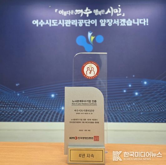 [ 한국미디어뉴스 이종철 기자 ] 여수시도시관리공단(이사장 송병구)은 한국경영인증원(KMR)으로부터 ‘노사관계 우수기업’ 인증을 4년 연속 획득했다고 19일 밝혔다.