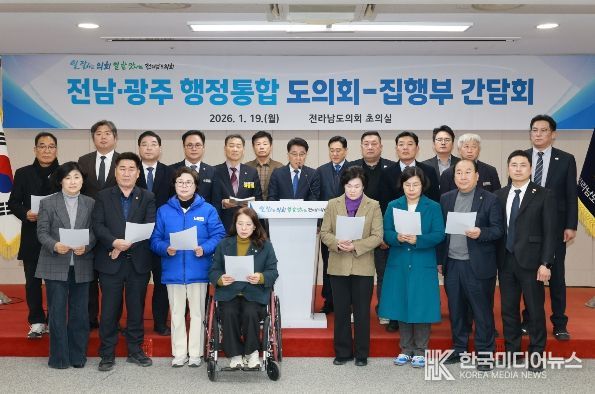 [ 한국미디어뉴스 이종철 기자 ] 전라남도의회는 19일 도의회에서 김영록 전라남도지사와 김대중 전라남도교육감이 참여한 가운데 ‘전남·광주 행정통합 도의회–집행부 간담회’를 열고, 통합 추진 방향과 주요 쟁점에 대해 심도 있는 논의를 진행했다.
