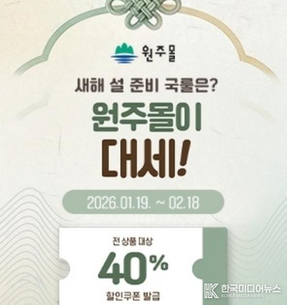 [ 한국미디어뉴스 이원영 기자 ] 원주시 공식 인터넷 쇼핑몰 ‘원주몰’이 설 명절을 맞아 다음 달 18일까지 ‘2026 원주몰 설맞이 기획전’을 진행한다.